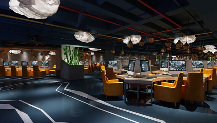 况琳设计师对接业主时,业主对地面设计提出多个需求,况琳设计师为此对网咖室内设计做了两张效果图供业主选择,最终业主选择了以玻化砖为地面铺设材料的装修方案,该项目为800平米没任何遮挡的空旷空间,为使网咖区域划分的更清晰,况设计师利用板材隔断材料划分网咖内不同功能区域,每个区域使用不同效果的灯饰,不同区域配上不同的座子及沙发,使网咖内每个区域的层次感更强。