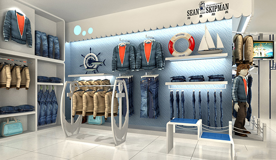 本案整体设计采用以呼应产品主题的海洋为元素,主色调为蓝色搭配体现温馨感的木纹材质,各种与航海有关的装饰点缀其中,整体营造出现代简约的风格。橱窗采用海洋元素装饰各海星,海螺散布其中搭配帆船等呼应产品主题,船帆桅杆烘托航海气息。门头简化处理体现时尚大气。