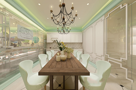 本案是位于南昌东湖区的一家160㎡的蛋糕店装案例。设计师通过细腻的手法和丰富的经验,巧妙用淡淡的薄荷色,搭配粉色和植物的味道,让人来到了春天的“桃花源”。墙饰方面贴了欧式线条,休息区则是仿真马卡龙定制,让人一进去就能体验产品的质感,有冲动掏腰包买一个。