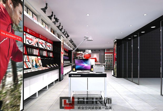 在联想的品牌基础上在店面设计上加入了时尚、休闲、科技等元素融入打造现代简约风格科技城,在大门设计上采用全透明式隔断玻璃设计醒目的红色logo让整个店门空间更有现代感,从店门可以看见里面分类的陈设让科技与实物的结合使顾客更有代入感,把店面前台放置在面铺最里面充分的保证了工作的私密性,三根方形柱子把产品分类陈放包柱的形象采用年轻休闲的人物形象让时尚休闲的主题更加突出。